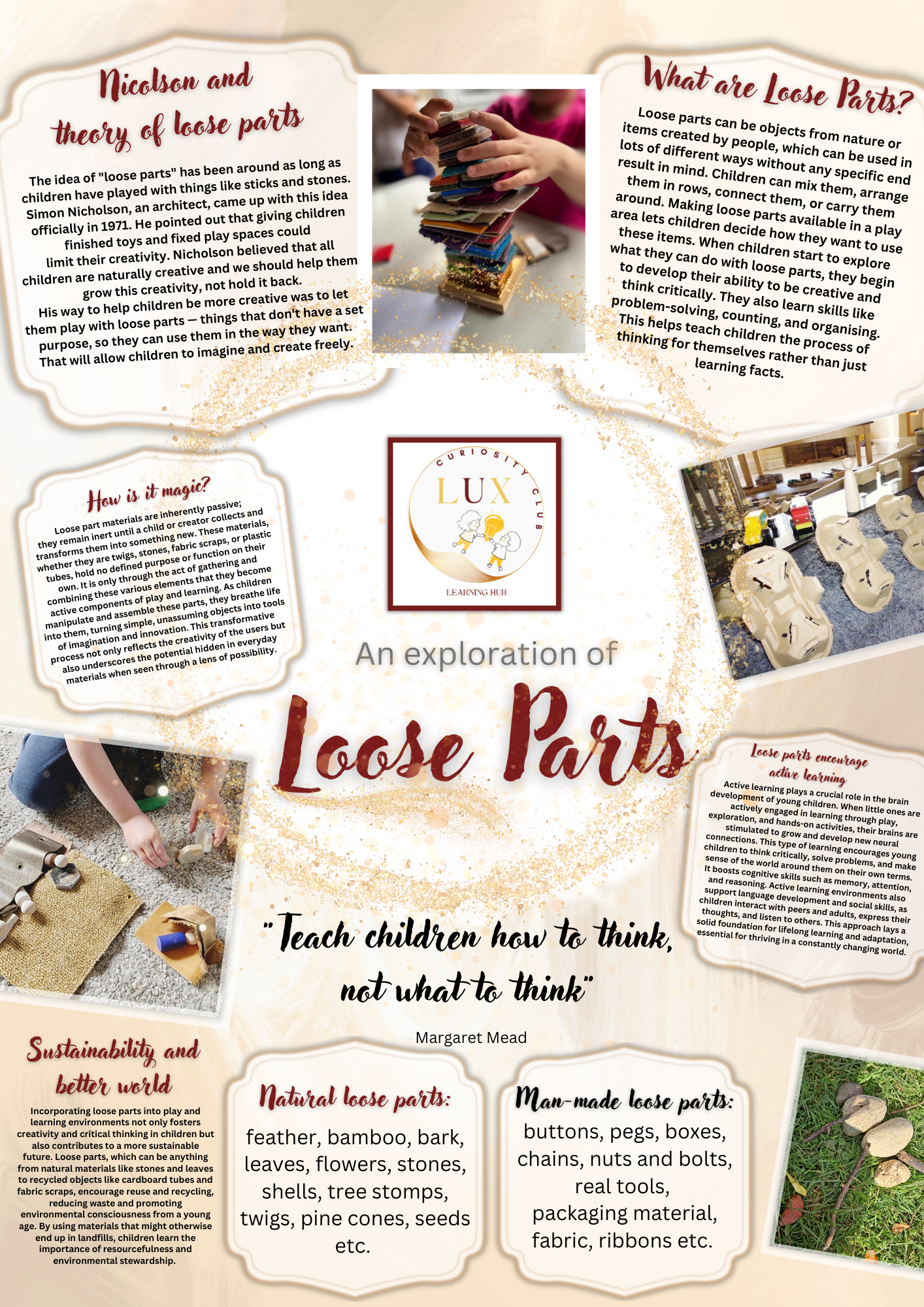 Incorporating loose parts into play and learning environments not only fosters creativity and critical thinking in children but also contributes to a more sustainable future. Loose parts, which can be anything from natural materials like stones and leaves to recycled objects like cardboard tubes and fabric scraps, encourage reuse and recycling, reducing waste and promoting environmental consciousness from a young age. By using materials that might otherwise end up in landfills, children learn the importance of resourcefulness and environmental stewardship.